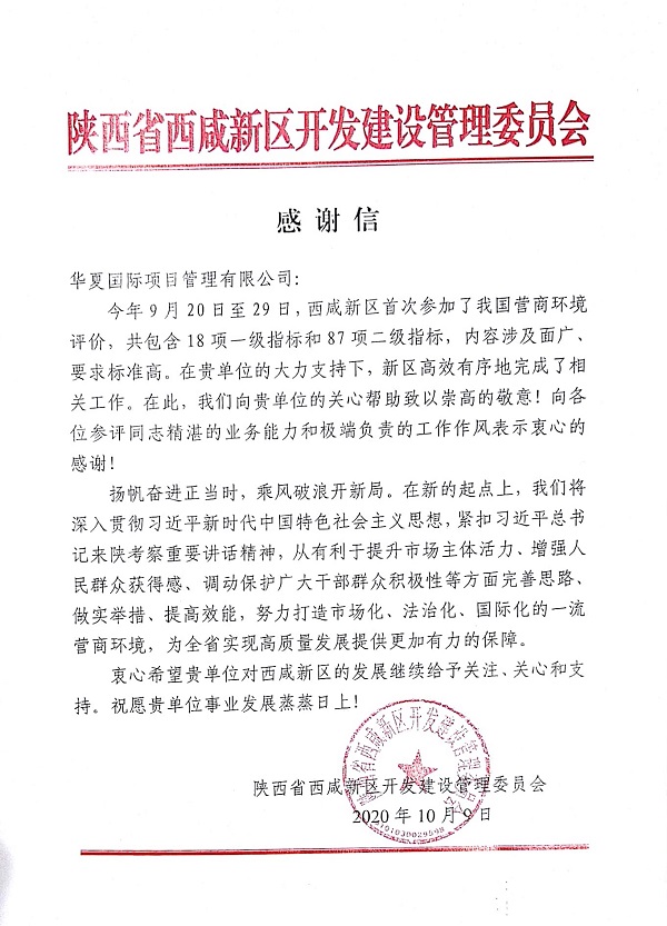 2020年10月9日,華夏國際項目管理有限公司收到了來自陜西省西咸新區開發建設管理委員會的一封感謝信。信中,西咸新區開發建設管理委員會對我公司在其參加中國營商環境評價中的大力配合,表示衷心感謝。該評價共包含18項一級指標和87項二級指標,內容涉及面廣、要求標準高,我公司各位參評人員以精湛的業務能力和高度負責的工作態度圓滿完成此次任務,受到客戶的肯定。